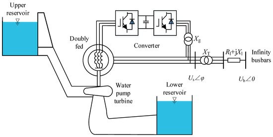 Doubly fed induction generator-based VSPS (DFIG-VSPS) (see Abbreviations) has been widely studied and applied in high-capacity applications owing to its low requirements for converter capacity and fast power regulation performance [5,6]. Although the DFIG improves the performance of the unit, it introduces new characteristics into the regulating system of the pump turbine. The excitation system and control strategy of the unit becomes complex, presenting a nonlinear system with a strong coupling of water, machinery, electricity, and control. The use of inverters results in isolation between the unit and power grid, decoupling the unit speed from the grid frequency, and the unit no longer provides inertial reserves for the power grid. These new characteristics inevitably have new impacts on the stability of both the unit and power grid. Therefore, it is necessary to study the small interference stability of the DFIG-VSPS.