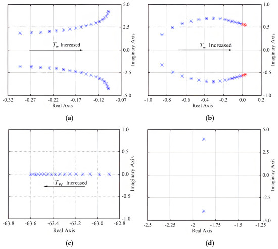 Eigenvalue trajectory with increasing Tw. (a) OM4, (b) OM5, (c) AM1, (d) OM2.