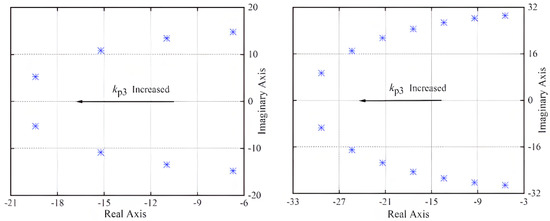 Figure 8 illustrates that the characteristic roots of OM4, OM5, and AM1, which have a strong correlation with the state variables of the water diversion system, change with the increase in Tw. This change is reflected in the complex plane being close to or far from the imaginary axis. The eigenvalues of OM2 with a participation factor of zero for the state variable of the water diversion system are unaffected by changes in the value of Tw, which also proves that the relevant state variables of the water diversion system do not participate in OM2, which is consistent with the conclusions drawn based on the participation factor in Section 4.2.