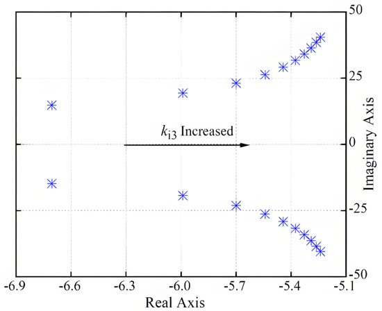 Further investigation was undertaken based on the calculation results of the participation factors to verify the relationship between the system OMs and state variables in Section 4.2 and to study the trend of system stability changes when parameters change. By changing certain parameters of the pump turbine and DFIG control system, the characteristic root change trajectories of OMs with high correlation with these parameters were studied, and the impact on system stability was analyzed.