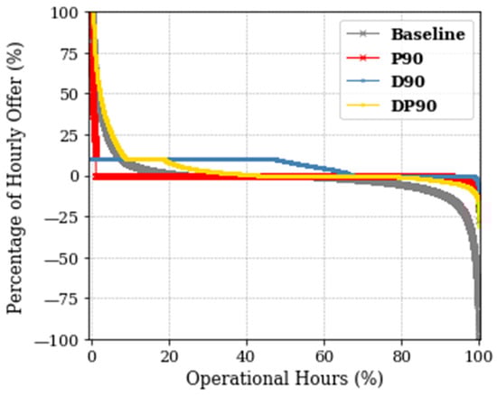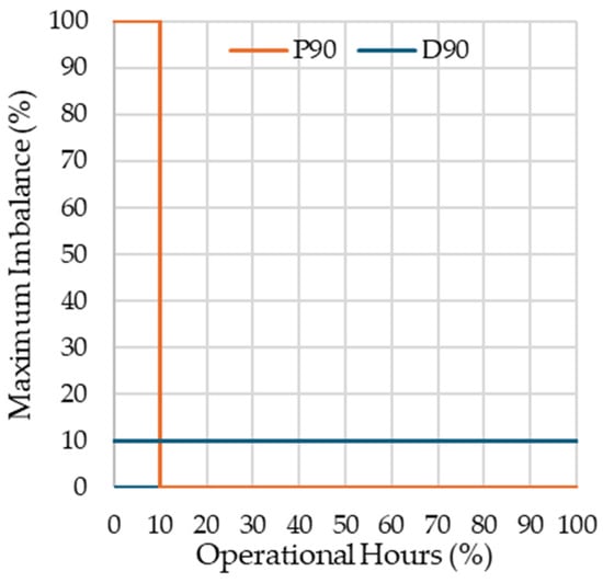 An alternative solution that further strengthens the incentive for stochastic players involves the integration of the two previous measures into a single mechanism, referred to as DP90. Under this approach, stochastic flexibility providers are allowed to deviate up to 10% from their allocated reserve capacity in any given period, and in addition, they may exceed this threshold in up to 10% of the periods over the course of a year. Given the inherent difficulty in predicting when these deviations will occur, this measure does not compromise system security when compared to the P90 approach—especially if Equation (1) is adopted—while offering a more favorable framework for stochastic participants. From the system operator’s perspective, applying the DP90 criterion means that vRES should be considered as operating according to the P90 criterion until more than 10% of the hours show deviations exceeding 10%. Once this threshold is surpassed, vRES are treated under the D90 criterion. In practice, this implies that system operation is as complex as under the P90 assumption whenever none vRES exceeds the 10% deviation limit. The operational complexity then gradually decreases as more vRES units surpass the P90 criterion and start complying with the D90 criterion.