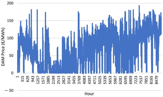 The complete formulation for the ideal case under perfect market foresight and the operational case is presented in []. The average remuneration, (€/MWh), for the study period is computed by dividing the total revenue across all hours by the total observed production:
