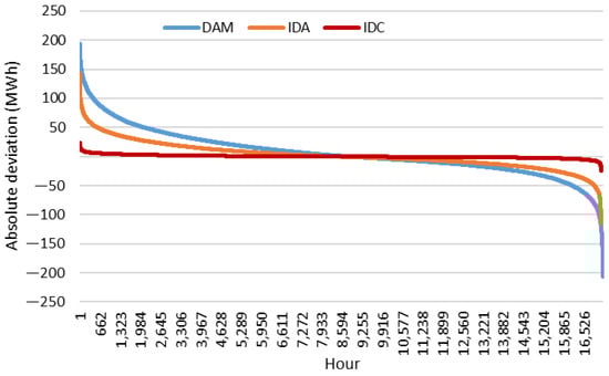 Absolute deviations of the DAM, IDA, and IDC forecasts.