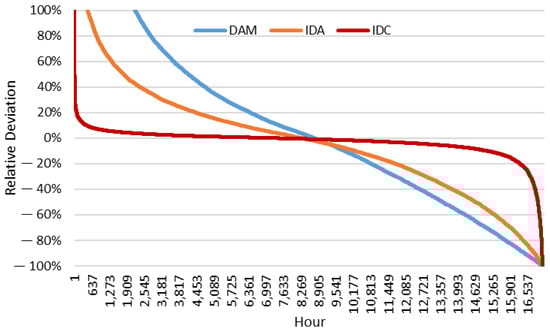Relative deviations of the DAM, IDA, and IDC forecasts.