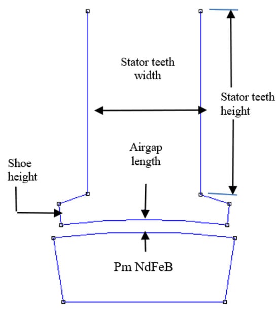 Research indicates that the interaction between rotor magnets and stator core teeth or slots induces cogging torque (CT) []. This generates a pulsating torque in the machine’s air gap []. A reduced distance between the magnet structure and the stator core further enhances CT. Moreover, augmenting the slot opening width at the stator core constitutes a critical parameter. Also, [] states that the CT in the air gap of a permanent magnet machine shows how the flux from the magnet’s edge interacts with the slot opening in the stator core. The impact of the CT on the PMG may reduce its initial capacity for self-rotation. The CT generates noise and mechanical vibrations while also impairing its autonomous startup capabilities []. The significant interaction between the magnetic force created by the magnet and the stator teeth is the cause of this. Consequently, the prime mover necessitates additional mechanical energy to rotate the machine’s rotor at its designated speed. Furthermore, the expenses associated with sustaining the renewable energy system will also increase. Due to the challenges in managing CT during generator operation, PMG designs with elevated CT volumes are unsuitable for use as generators in renewable energy systems. Unlike a machine employed in electrical motor operation, a motor’s CT content can be modified and adjusted to satisfy operational requirements.