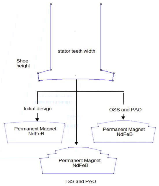 Figure 3 illustrates the configuration of the stator teeth with three distinct designs of permanent magnets (NdFeB)—initial, OSS with PAO, and TSS with PAO—while maintaining uniformity in the width of the stator teeth and the height of the shoe. The preliminary design has a virtually flat magnet configuration with an expanded cross-sectional area, potentially enhancing flux while also resulting in elevated cogging torque. The OSS and PAO arrangement implements a more arcuate magnet profile to enhance flux distribution and diminish cogging torque. Simultaneously, the TSS and PAO design uses a two-step slotting configuration, enhancing the flux path and significantly reducing torque ripple.