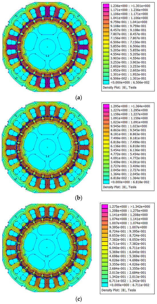 Magnetic flux density of PMMs studied. (a) Initial structure. (b) One step of slotting. (c) Proposed PMG structure (combining the TSS and PAO techniques).
