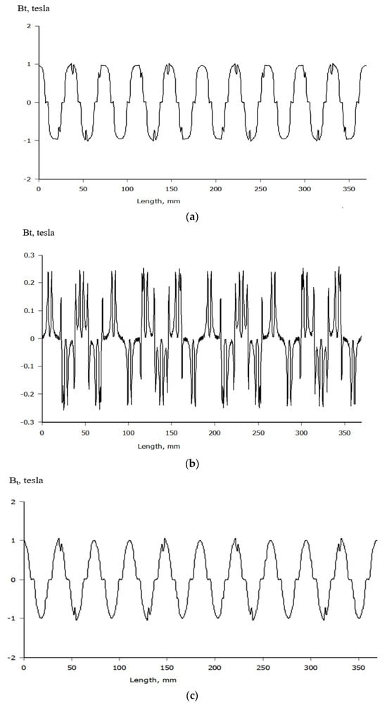 Figure 6a presents the distribution of magnetic flux density in the initial PMG configuration. A significant flux concentration is noted in the stator teeth, with maximum values surpassing 1.3 T, signifying localized magnetic saturation. The flux lines are concentrated and irregularly dispersed, potentially resulting in increased cogging torque and diminished magnetic coupling efficiency. The application of the TSS approach at the machine’s magnet edge reduces the tangential magnetic flux density at that location. The tangential magnetic flux density reduces because of the single steps of slotting (OSS) and TSS in making the magnet, which can be seen in Figure 6b,c. Nonetheless, the TSS technique may diminish the tangential magnetic flux density to a greater extent than the OSS strategy. This change may be attributable to the increase in the point coordinates of the magnet using the TSS approach. The amplitude of CT diminishes at greater levels. Both TSS and OSS display virtually identical peaks in tangential magnetic flux density. Conversely, in comparison to OSS, TSS generally exhibits a reduced magnetic flux density profile. The normal magnetic flux density of TSS frequently exhibits a sine wave pattern, as illustrated in Figure 7e. The suggested PMG has the lowest amount of total magnetic flux entering the air gap compared to the original structure and OSS, which is used as the PMG baseline model.