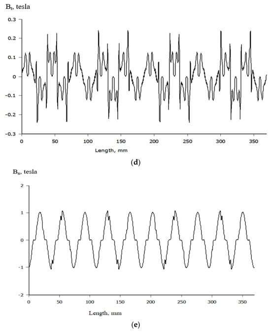 Magnetic flux density at the air gap of the PMGs studied. (a) Normal flux density at the airgap of the initial design. (b) Tangential flux density at the airgap of the initial design. (c) Normal flux density at the airgap of the PMG with one-step slotting at the magnet edge. (d) Tangential flux density at the airgap of the PMG with one-step slotting at the magnet edge. (e) Normal flux density at the air gap of the proposed PMG combining the TSS and PAO techniques at the magnet edge.