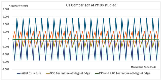 A critical element in the application of PMGs in renewable energy systems is the CT peak value. The CT peak of a PMG utilized in a renewable energy system must be minimized as much as possible to optimize PMG performance. The study analyzed and presented the CT result values of the PMGs under examination. The application of the TSS and PAO technique at the PMG’s magnet edge indicates a significant reduction. Equation (7) is employed to determine the CT values of the PMGs under examination. Figure 8 illustrates the comparison of CT values among the examined PMGs.