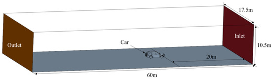 1. Open Domain: A rectangular space (60 m × 17.5 m × 10.5 m) simulating real-world driving conditions, ensuring minimal interference with airflow calculations. This design avoids unnecessary interference to the flow field caused by a small computational domain, ensuring the accuracy and completeness of flow field calculations. The structure and dimensions of the open domain are shown in Figure 1.