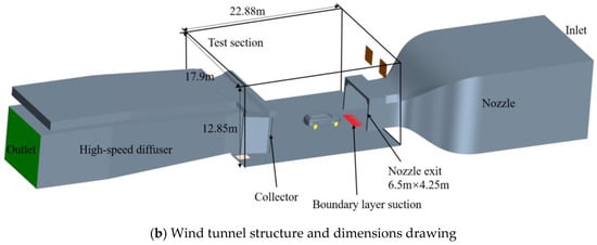 Using a full-scale aerodynamic acoustic wind tunnel (AAWT), equipped with a five-belt balancing system and boundary layer control systems (BLCs). The five-belt balancing system can accurately measure the aerodynamic forces and torques of the vehicle under different driving attitudes, and the boundary layer control systems effectively control the thickness of the boundary layer inside the wind tunnel, reducing the interference of the boundary layer on the experimental results, ensuring the accuracy and reliability of the experimental data [18].