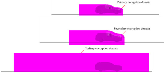 The research on grid independence refers to the findings of Liao G et al. [11] The open domain and virtual wind tunnel use the same mesh strategy as shown in Table 1 and structure of the three-level encryption domain as shown in Figure 3. The encrypted separation area and near-wall area: Grid densification is performed in areas prone to flow separation and significant boundary layer effects, such as the vehicle’s rear and bottom, to capture fine flow field characteristics such as flow separation and boundary layer thickness changes, providing a foundation for accurate calculation of air resistance and pressure distribution.