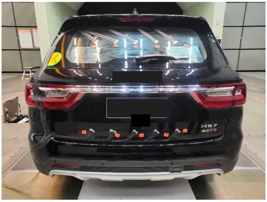 As shown in Figure 4, ten surface pressure measurement points are set at the vehicle rear to comprehensively collect vehicle surface pressure distribution data, analyze the pressure change law, accurately measure the rear vortex structure and velocity field information, deeply explore the rear flow field characteristics, and provide key data support for optimizing the vehicle’s rear aerodynamic performance [19].