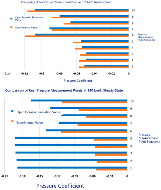 In the transient simulation at 120 km/h, the difference between the simulation values and the experimental values is significant. This may be due to the fact that transient simulation needs to consider more dynamic factors, such as vehicle acceleration, deceleration, and air flow instability, which are difficult to fully capture in the simulation, leading to a significant deviation between the simulation results and the actual experimental values. In the steady-state simulation at 140 km/h, the difference between the simulation values and the experimental values is smaller. Steady-state simulation assumes that the vehicle is traveling at a constant speed, with relatively stable air flow, so the simulation results are closer to the actual experimental values.