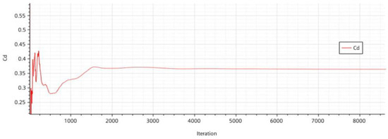 The horizontal axis of Figure 6 is the number of iterations, ranging from 0 to 8000, and the vertical axis is the drag coefficient Cd, with a range of approximately 0.25 to 0.55. The curve fluctuates greatly at first, especially within the first 1000 iterations, where the Cd value rapidly rises from around 0.25 to around 0.5, then gradually decreases and stabilizes, finally settling around 0.35.