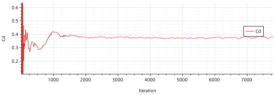 The horizontal axis of Figure 7 is also the number of iterations, ranging from 0 to 7000, and the vertical axis is the drag coefficient Cd, with a range of 0.2 to 0.6. The curve also has a significant fluctuation at the beginning, but it is slightly smaller than that in Figure 6. The Cd value starts from around 0.2 and quickly rises to around 0.4, then gradually decreases and stabilizes, finally settling around 0.4.