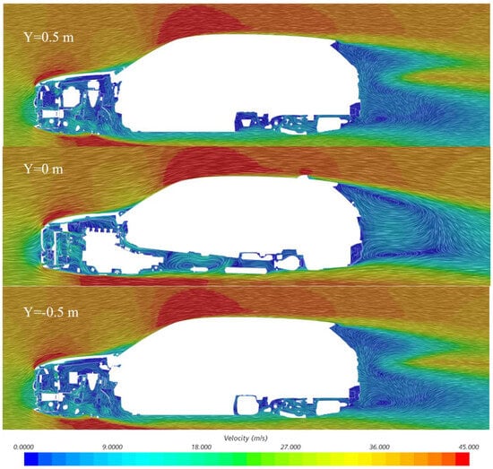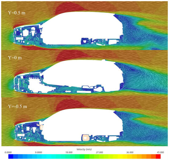 3. Y = −0.5 m. The k-ω model: Velocity in the rear underbody region may significantly decrease to 0.00 m/s, revealing a strong separation zone (e.g., downstream of the diffuser), consistent with experimentally observed separation bubbles. Asymmetric velocity distributions near the front wheels (e.g., 18.00 m/s on the left vs. 27.00 m/s on the right) reflect its adaptability to complex geometries, such as rotating tires.
