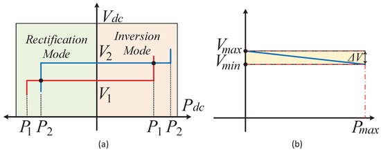 The voltage droop method is based on the active power-frequency droop concept in AC systems. It distributes voltage regulation among multiple converters by sharing active power according to their droop characteristics, but achieving precise power sharing among terminals is challenging. Due to the non-linear relationship between voltage and real power, an increase in power requires the voltage to decrease to balance the power in the grid, as shown in Figure 1. Additionally, the available power for sharing is limited by the predefined droop controller coefficient. The droop gain is commonly determined based on the converter’s rating. However, increasing the droop gain can potentially impose greater responsibility on the converter to regulate voltage, thereby placing constraints on power sharing among MT-HVDC converters. Furthermore, variations in droop gain between converters may lead to power mismatch issues [17].