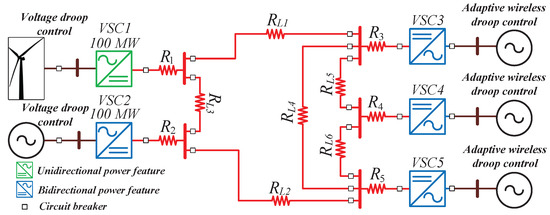 The AWD control strategy is implemented in a mesh MT-HVDC system, as shown in Figure 2. The system consists of two rectifier stations that control voltage and three inverters that wirelessly regulate power sharing using the AWD method. The mesh MT-HVDC system is selected to showcase the capabilities of both methods in various mesh configuration scenarios. The system in Figure 2 is based on [26], considering that the resistance may vary between different transmission lines, to establish the system’s feasibility across diverse configurations. The wind turbine as a renewable energy resource is considered purely by choice, and it does not restrict readers from including other energy sources to replace it.