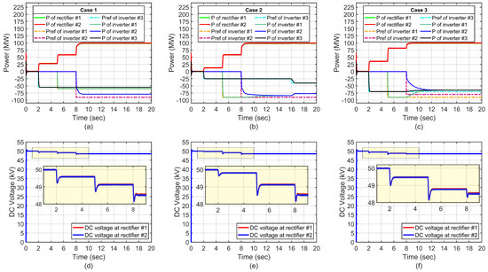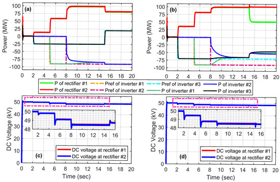 Figure 4c shows the simulation results for the cases of inverters and requesting power above their agreement, which is not available at the rectifier station, while inverter requests power within the limits of the agreement. Figure 4d shows the DC-link voltage for this scenario.