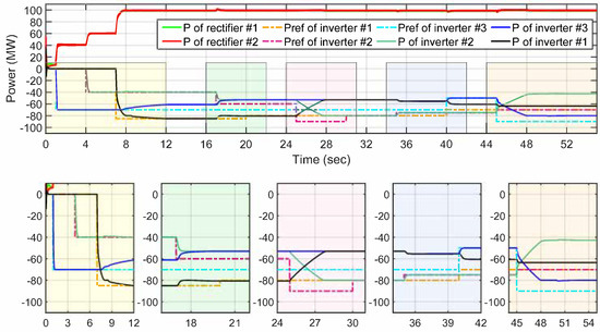 At s, inverter requests 55 MW of power, which is available at the rectifier station. This request is fulfilled if there are no other requests from the remaining inverters. At the same time, the DC-link voltage decreases to approximately 49.1 kV in accordance with the characteristics of the droop controller.