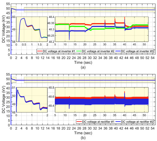At s, inverter begins to request 25 MW of power, which is available at the rectifier station, while the remaining inverters are still inactive. Furthermore, both rectifiers deliver the available power to the inverters while maintaining equal power sharing between themselves. Meanwhile, the DC-link voltage decreases to approximately 49.5 kV.