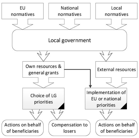 LGs act in the interest of their residents by fulfilling both delegated responsibilities (as agents) and autonomous functions (as owners). In the areas of delegated authority, LGs have limited flexibility, as they are bound by EU regulations, transposed directives, and national policy documents (Figure 1) []. For example, municipalities typically support GD initiatives funded by the EU or national governments, as these projects often boost local employment and welfare in the short term. However, when additional local resources are required, LGs tend to conduct more comprehensive evaluations, which may include consultations with interest groups such as business associations, residents’ councils, and NGOs.