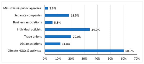 To better understand the types of interests that must be balanced in building energy performance decisions, the authors analyzed publicly available records from discussions on national drafts of the Climate Law [] and the Transport Energy Law [], both of which transpose relevant EU directives. The reviews and opinions submitted during these discussions—by ministries, public agencies, business associations, trade unions, municipal associations, and individual activists (e.g., entrepreneurs and environmental advocates)—generally reflect the stance of organized civil society on GD initiatives in the geopolitical context of 2024 (Figure 2).