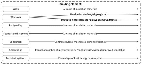 In the second stage, certain simplifications were applied to facilitate calculations while maintaining an acceptable level of accuracy. The methodology for the selection of less important entities included the per-element modelling of heat losses and subsequent expert assessment of the entities’ fixed values. Only the KPIs remained necessary as independent variables for their use in calculations of the elements’ models while heat loss ΔQ was the dependent variable of the models in all cases. The following key assumptions and generalizations were applied; those for building elements are shown in Figure 3.