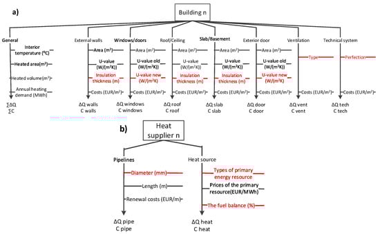 KPIs of the elements of the building (a) and heat supplier (b). ΔQ—heat loss change, c—costs; the fixed indicators are marked in black; the red ones are independent variables and can be changed while searching for the optimal project version. Developed by the authors.