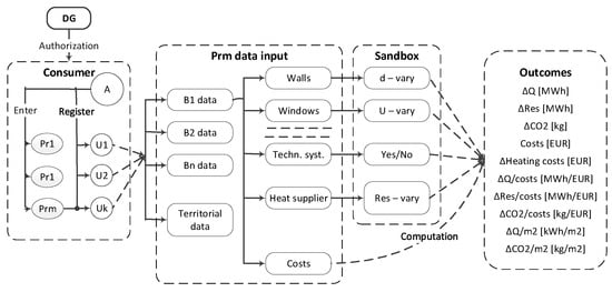 Consumer administrators manage thermal efficiency projects (Prm) and register individual users (Uk), granting them access to the platform for executing heating system projects. These projects may include components such as buildings (Bn), heat suppliers, and inlet pipes. After data entry, users can begin developing project versions within the innovation sandbox and identify the optimal configuration.