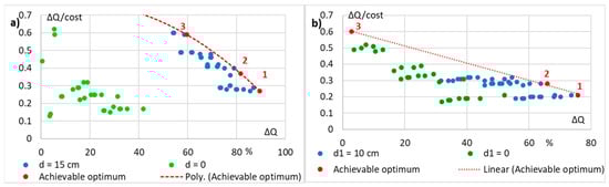 The innovation sandbox functionality is illustrated using the partial result sets for renovation projects targeting apartment buildings from Series No. 316 (Figure 6a) and Series No. 602 (Figure 6b), prepared at the request of the Ministry of Economy. The red data points and trendlines represent the achievable performance thresholds for building renovation.