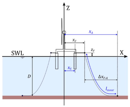 In Figure 2, the relevant quantities that will be modified during the preliminary optimization are colored in blue. The mooring line length factor, indicated in the table presented above, represents a measure of the mooring line length nondimensionalized with respect to the distance between the fairlead and the anchor point, and it is defined as follows: