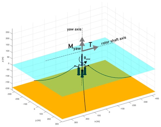 On the other hand, some possible disadvantages of this choice should also be pointed out; for example, the presence of large bodies at a significant distance from the yaw axis is potentially associated with larger damping on the yaw degree of freedom, which may be detrimental to the implementation of control schemes requiring significant yaw motion. The data summarized below describe the baseline configuration for the platform and the nacelle–tower assembly (Table 1 and Table 2). It must also be noted that, in the remainder of this work, and to simplify the effects of the control strategy on the yaw motion of the system, the loads generated by wind and the effects of the pitch control on the aerodynamics of the system are simulated through point forces and moments at the hub. Thus, the rotor dynamics are replaced by a prescribed force, simulating the thrust force, and a prescribed sinusoidal moment, simulating the cyclical loads imposed by the control strategy.