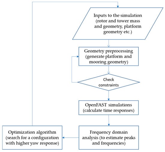 As has emerged from recent developments, the design and optimization of FOWTs poses a unique challenge, in which loads coming from aerodynamic and hydrodynamic phenomena are coupled with the mooring reaction, structural deformation, and control actuation, leading to the need for multi-physics analyses. An FOWT is usually designed to deliver the best operational service, i.e., the highest production of electricity given the available wind resources, while ensuring survival under extreme fatigue loads and abnormal loads arising from the occurrence of faults and transient conditions. To demonstrate the feasibility of the optimization of a well-known FOWT configuration for the implementation of an innovative wake control strategy, a framework was developed integrating a simulation-based approach, employing a well-known mid-fidelity multi-physics environment [], and the automatic generation of different platform geometries and mooring line layouts. Such a simulation-based approach involves using numerical models to simulate the behavior of the FOWT system with a chosen level of fidelity and then using the analyzed performance to carry out optimization. The optimizer generates new values for the design variables and, through a dedicated algorithm, performs the operations needed to find an optimal solution, i.e., one that minimizes the objective function. Among the other types, heuristic algorithms have been proven to be very efficient in finding optimal solutions in the field of FOWTs and other complex systems. These algorithms (see [] for an exhaustive description) try to mimic natural evolution by selection, applying the “survival of the fittest” principle in a certain population of individuals. Generation by generation, the characteristics of the fittest individuals are inherited by new ones to maintain the characteristics that return the best objective function evaluation. Through this metaphor, the individuals are represented by specific configurations of FOWTs, and the objective function is evaluated based on a particular system’s performance. Differing from gradient-based approaches, which are based on the gradient estimation of the objective function to find the global optimum, evolutionary algorithms do not require the continuity of the objective function because no assumption is made regarding the mathematical nature of the optimum. Hence, they are particularly well suited for the evaluation of non-linear discontinuous objective functions, such as when the objective function is evaluated based on the post-processed outputs of FOWT time simulations (see [], where the authors chose to use a different non-gradient-based algorithm with OpenFAST simulations). The combination of heuristic optimization algorithms and numerical simulations offers a powerful tool for the design and optimization of FOWTs, as it allows for the exploration of many design options without the need to evaluate gradients. This work presents the following contributions: