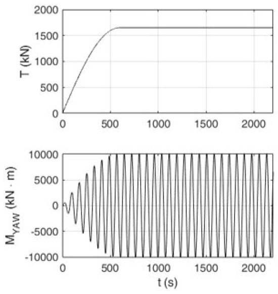 Applied loads of time histories. The thrust value was chosen based on the DTU 10 MW RWT’s performance, while the yaw moment time history was obtained from internal discussions with the developers of the control strategy [].
