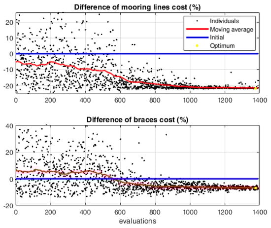The post-processed outputs and the differences in costs with respect to the baseline configuration are shown in Figure 11 and Figure 12, respectively. In this second run, where no cost constraint was applied (i.e., = 0), a larger variation in both the platform geometry and mooring lines could be observed (in Figure 10, the optimal spar distance is 24 m), with a somewhat surprising reduction in the mooring and platform costs (Figure 12), which was related to the reduction in both the structure’s size and the mooring lines’ length in the final configuration. The yaw amplitude motion is increased to 13.6 deg, while both design constraints remain within the boundaries (the surge is 25 m and the heeling angle is 3.08 deg). A summary of the main results obtained from the performed optimization runs is reported in Table 5, which indicates the variations in the considered platform parameters, together with the design and constraint variables.