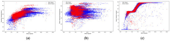 By visualizing key data features correlated with wind speed signals, as illustrated in Figure 5, this approach provides deeper insights into the complex interplay between critical parameters such as generator speed, gearbox oil tank pressure, and gearbox bearing temperature. These insights lay the groundwork for identifying both operational trends and potential anomalies in gearbox performance, thereby ensuring a robust understanding of system behavior.