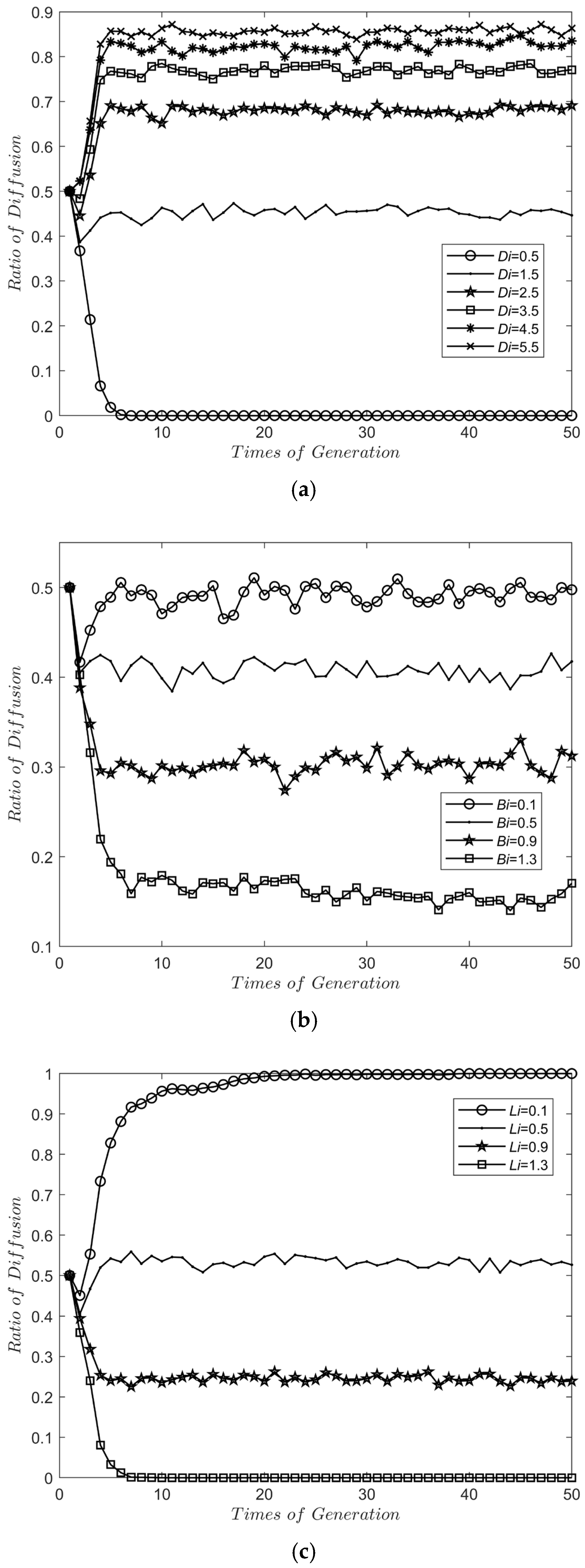 4.3.1. Influence of Simulation Experiment Scale on the Diffusion of Green Energy Technology Innovation