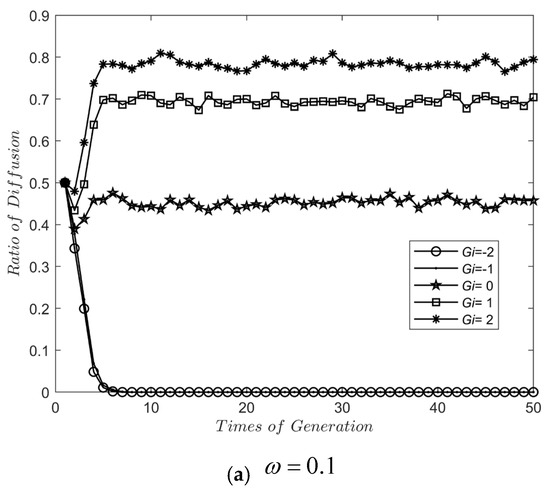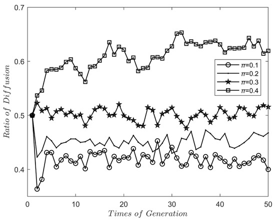 Figure 6a–c demonstrate the impact of the technology obsolescence risk, free-riding risk, and technology leakage risk on the diffusion of green energy technology innovations, in that order. Figure 6a demonstrates the impact of the technology obsolescence risk on the diffusion of green energy technology innovation. With the increase in the technology obsolescence risk, the degree of green energy technology innovation diffusion will gradually increase, but the degree of increase shows a marginal decreasing trend. Figure 6b demonstrates the impact of free-riding on the diffusion of green energy technology innovation. As the damage of free-riding behavior to partners increases, the decline in the degree of diffusion of green energy technological innovation shows a significant marginal incremental characteristic and is ultimately maintained at a lower level. Figure 6c demonstrates the impact of the technology leakage risk on the diffusion of green energy technology innovation. As the risk of technological leakage increases, the diffusion of green energy technology innovation will change from the “full diffusion” state to the “no diffusion” state.