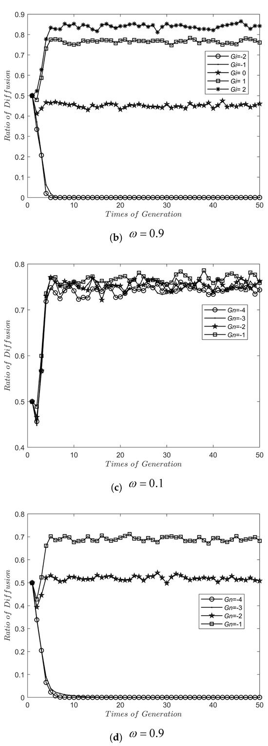 Figure 5 illustrates the impact of policy uncertainty on the diffusion of green energy technology innovation, which contains four scenarios based on different policy combinations: a two-party favorable policy, a two-party non-favorable policy, a favorable policy of the home side and non-favorable policy of the partner side, and a favorable policy of the partner side and non-favorable policy of the home side. The specific analysis is shown below: