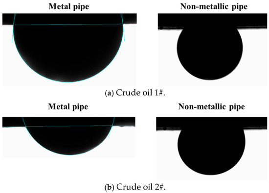 Interfacial characteristic experiments were conducted using a contact angle tester on crude oils from #1 to #3, as well as the metallic and non-metallic pipeline materials. From the perspective of the microscopic interfacial energy theory, the wall-sticking mechanism of crude oil in non-metallic pipelines was investigated, revealing the underlying reasons for the differences in the wall-sticking behavior between the metallic and non-metallic pipelines. The results of the interfacial characteristic tests are shown in Figure 6, Figure 7 and Figure 8. The contact angles shown in Figure 6 are the average values from three repeated experiments, and the maximum relative error among all the test results does not exceed 6%.