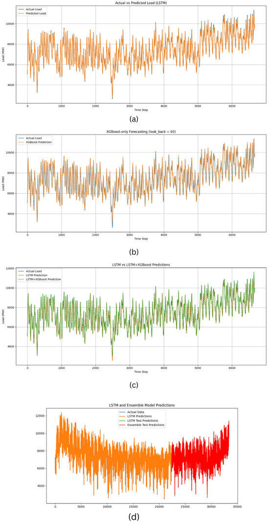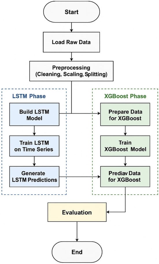 The advancement in the industrial sector has accelerated the creation of data, especially time series data, which play an important role in various aspects such as finance, health care, climate forecasting, energy, and so on. Time series forecasting is the key to efficiency in resource management, organizational productivity enhancement, and the facilitating of operational decisions. Demand forecasting is critical in the energy sector for demand–supply management, the integration of renewables and managing the risk of power failures [1,2]. The improvement of computational efficiency has led to the application of machine learning (ML) and deep learning (DL) models in time series forecasting. Compared to statistical models like the ARIMA and SARIMA models, which are linear and stationary, ML models are well suited to non-linear, non-stationary, and high dimension processing [3]. In analyzing the sequential data, LSTM networks that belong to the RNN category have shown good results in expressing temporal relationships. Two major issues persist: comprehensiveness and interpretability [4,5]. In this work, an improved approach that combines the advantages of both LSTM and XGBoost has been advanced to increase accuracy as well as workability in time series data forecasting, where energy load prediction is used as a specific use case.