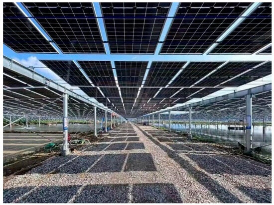 Driven by the global transition in the energy structure and the pursuit of sustainable development, photovoltaic (PV) technology—an essential pillar of clean energy—is undergoing unprecedented growth. According to statistics from the International Renewable Energy Agency (IRENA), the newly installed PV capacity worldwide reached 452 GW in 2024, with the total cumulative capacity surpassing 1.85 TW. Of this, China contributed over 0.9 TW, accounting for 48.5% of the global total, and led the world with an annual addition of 280 GW [1]. This explosive growth is not only transforming the traditional energy supply landscape but also promoting continuous technological innovation in the PV sector. Amidst this evolution, glass–glass PV modules have emerged as a mainstream choice due to their outstanding mechanical strength and weather resistance. Simultaneously, cable-suspended PV systems have seen widespread application in large-scale solar farms owing to their lightweight design and adaptability to complex terrains. As shown in Figure 1, the combined use of glass–glass PV modules and cable-suspended PV systems has demonstrated considerable effectiveness in engineering practice.