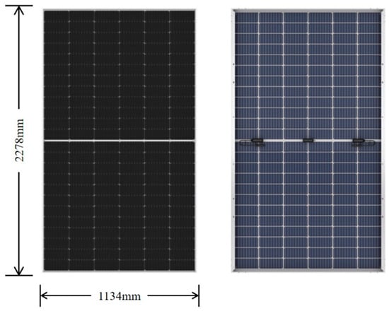 As shown in Figure 4, the mainstream glass–glass PV modules currently used in PV systems in the Chinese market have dimensions of 2278 mm × 1134 mm × 35 mm. Both the front and back glass layers are made of 2 mm thick heat-strengthened glass. Based on this module specification, this study develops finite element models under different design strategies to investigate the mechanical performance of the glass–glass PV modules.