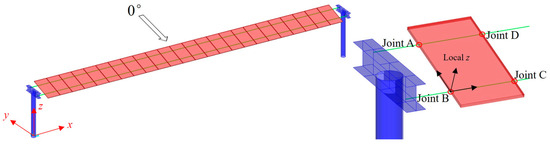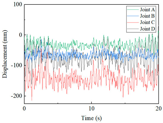 Time history analysis under a 0° wind direction (suction) and a wind speed of 28.3 m/s (corresponding to a wind pressure of 0.5 kN/m2) yielded the local Z-direction (i.e., normal to the module surface) displacement responses of the four connection nodes on an edge-span glass–glass PV module, as shown in Figure 8. It is observed that the displacements of the four nodes are not synchronized, which indicates that the overall motion of the module comprises both rigid-body movement and elastic deformation.