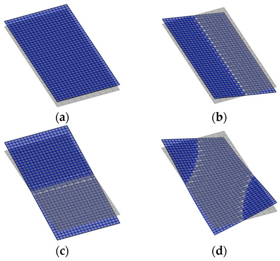 Based on the above theory and considering the displacement characteristics of glass–glass PV modules on the cable-suspended PV system, a set of displacement modal vectors , , , is selected. These modal vectors correspond, respectively, to the vertical translation, rotation about the longitudinal axis, rotation about the transverse axis, and torsion of the module. The mode shapes corresponding to the modal vectors are illustrated in Figure 9. The modal vectors of the module and the corresponding displacement modal matrix are given as follows: