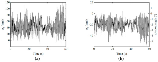 Based on the above analysis, the ESM can be considered a reliable substitute for the HFM in dynamic wind-induced vibration analyses of a cable-suspended PV system, with a high level of accuracy. A finite element wind-induced vibration analysis is conducted using the ESM under the same wind speed of 28.3 m/s (corresponding to a wind pressure of 0.5 kN/m2). The resulting modal coordinates of the glass–glass PV modules under both wind suction and wind pressure conditions are presented in Figure 13 and Figure 14. To further investigate the wind-induced vibration characteristics of the cable-suspended PV system, the figures include the modal coordinate results for both edge-span and mid-span glass–glass PV modules.