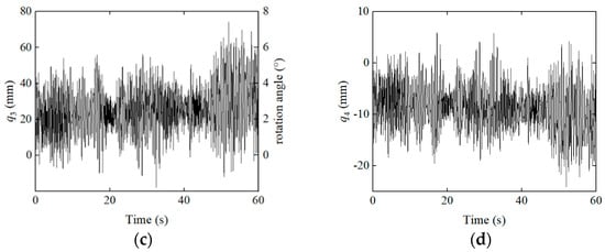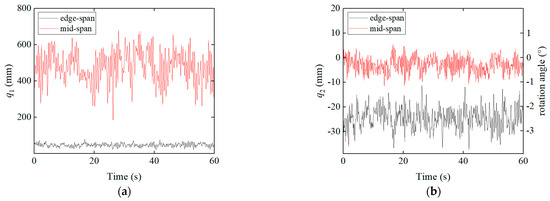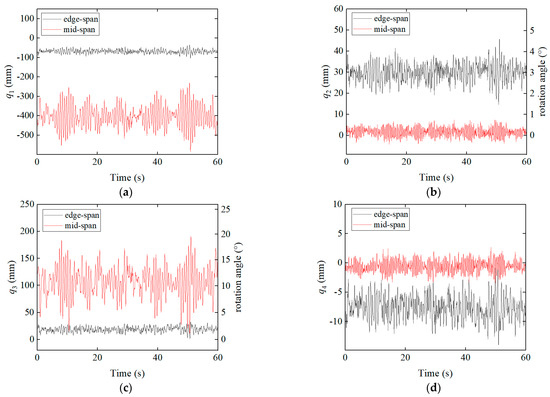 Mid-span and edge-span PV modules and their modal coordinate time histories (28.3 m/s, pressure): (a) Vertical translation; (b) Longitudinal rotation; (c) Transverse rotation; (d) Torsion.